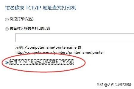 4、点击“下一步”,选择“使用TCP/IP地址或主机名称添加打印机(I)”。