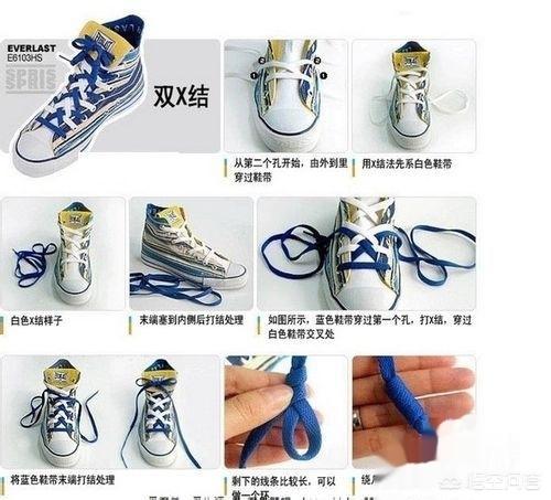 5.如图所示,蓝色鞋带穿过第一个孔,打X结,穿过白色鞋带交叉处;