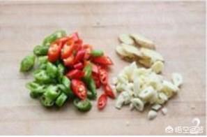 2、青红尖椒斜切成圈,大蒜切末,生姜切片。