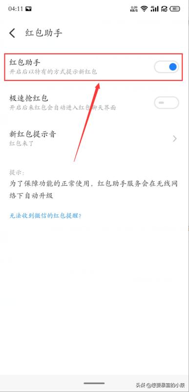 4、点击【红包助手】这个功能,开启【红包助手】和【新红包提示音】。